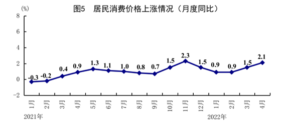 1-4月份,全国居民消费价格(CPI)同比上涨1.4%。4月份,全国居民消费价格同比上涨2.1%,涨幅比上月扩大0.6个百分点;环比上涨0.4%。分类别看,食品烟酒价格同比上涨1.9%,衣着价格上涨0.5%,居住价格上涨1.2%,生活用品及服务价格上涨1.2%,交通通信价格上涨6.5%,教育文化娱乐价格上涨2.0%,医疗保健价格上涨0.7%,其他用品及服务价格上涨1.7%。在食品烟酒价格中,粮食价格上涨2.7%,鲜果价格上涨14.1%,鲜菜价格上涨24.0%,猪肉价格下降33.3%。扣除食品和能源价格后的核心CPI同比上涨0.9%,涨幅比上月回落0.2个百分点。