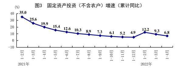 1-4月份,全国固定资产投资(不含农户)153544亿元,同比增长6.8%,比1-3月份回落2.5个百分点。分领域看,基础设施投资同比增长6.5%,制造业投资增长12.2%,房地产开发投资下降2.7%。全国商品房销售面积39768万平方米,同比下降20.9%;商品房销售额37789亿元,下降29.5%。分产业看,第一产业投资同比增长5.8%,第二产业投资增长12.6%,第三产业投资增长4.3%。民间投资增长5.3%。高技术产业投资增长22.0%,其中高技术制造业和高技术服务业投资分别增长25.9%、13.2%。高技术制造业中,电子及通信设备制造业、医疗仪器设备及仪器仪表制造业投资分别增长30.8%、29.4%;高技术服务业中,科技成果转化服务业、研发设计服务业投资分别增长21.9%、21.1%。社会领域投资增长14.4%,其中卫生、教育投资分别增长24.9%、12.5%。4月份,固定资产投资(不含农户)环比下降0.82%。