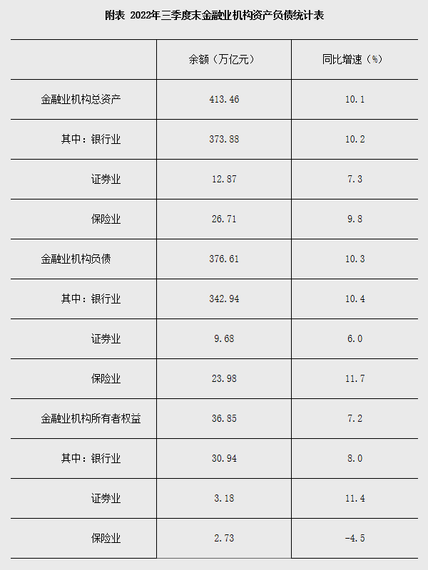 初步统计,2022年三季度末,我国金融业机构总资产为413.46万亿元,同比增长10.1%,其中,银行业机构总资产为373.88万亿元,同比增长10.2%;证券业机构总资产为12.87万亿元,同比增长7.3%;保险业机构总资产为26.71万亿元,同比增长9.8%。