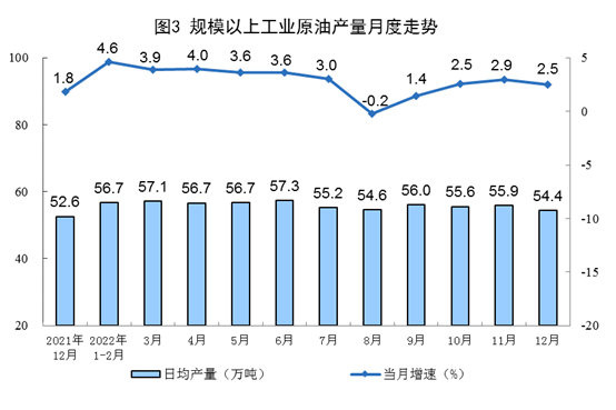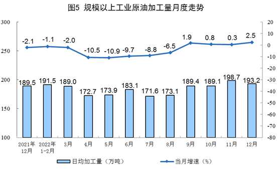 原油加工增速有所加快。12月份,加工原油5988万吨,同比增长2.5%,增速比上月加快2.2个百分点,日均加工193.2万吨。2022年,加工原油67590万吨,同比下降3.4%。