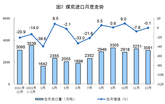 2022年,生产原煤45.0亿吨,同比增长9.0%。进口煤炭2.9亿吨,同比下降9.2%。