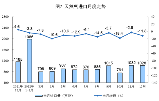 天然气生产增速有所放缓,进口降幅扩大。12月份,生产天然气204亿立方米,同比增长6.5%,增速比上月放缓2.1个百分点,日均产量6.6亿立方米。进口天然气1028万吨,同比下降11.8%,降幅比上月扩大9.0个百分点。