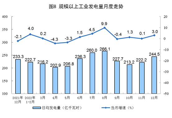 电力生产增速加快。12月份,发电7579亿千瓦时,同比增长3.0%,增速比上月加快2.9个百分点,日均发电244.5亿千瓦时。2022年,发电8.4万亿千瓦时,同比增长2.2%。