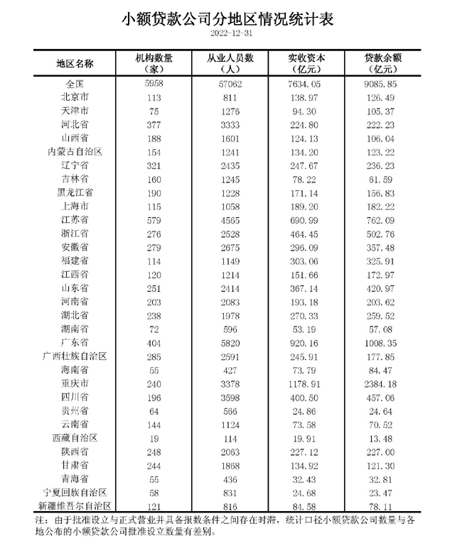 截至2022年12月末,全国共有小额贷款公司5958家。贷款余额9086亿元,全年减少337亿元。