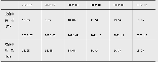 注4:自2022年12月起,“流通中货币(M0)”含流通中数字人民币。12月末流通中数字人民币余额为136.1亿元。修订后,2022年各月末M1、M2增速无明显变化。修订后M0增速如下: