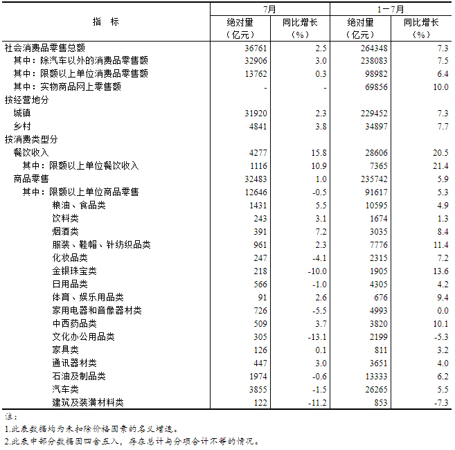 7月份,社会消费品零售总额36761亿元,同比增长2.5%。其中,除汽车以外的消费品零售额32906亿元,增长3.0%。