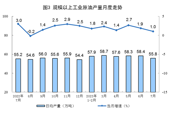 原油产量小幅增加,进口保持较快增长。7月份,生产原油1731万吨,同比增长1.0%,增速比6月份放缓0.9个百分点,日均产量55.8万吨。进口原油4369万吨,同比增长17.0%,增速比6月份回落28.4个百分点。
