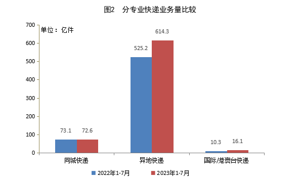 1—7月,同城快递业务量累计完成72.6亿件,同比下降0.7%;异地快递业务量累计完成614.3亿件,同比增长17.0%;国际/港澳台快递业务量累计完成16.1亿件,同比增长57.2%。