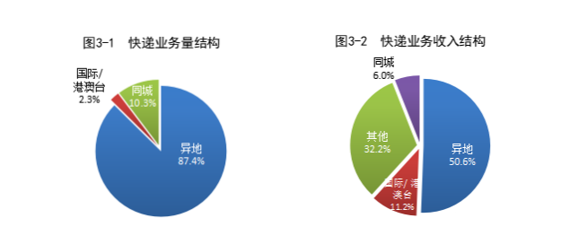 1—7月,同城、异地、国际/港澳台快递业务量分别占全部快递业务量的10.3%、87.4%和2.3%;业务收入分别占全部快递收入的6.0%、50.6%和11.2%。与去年同期相比,同城快递业务量的比重下降1.7个百分点,异地快递业务量的比重上升1.1个百分点,国际/港澳台业务量的比重上升0.6个百分点。