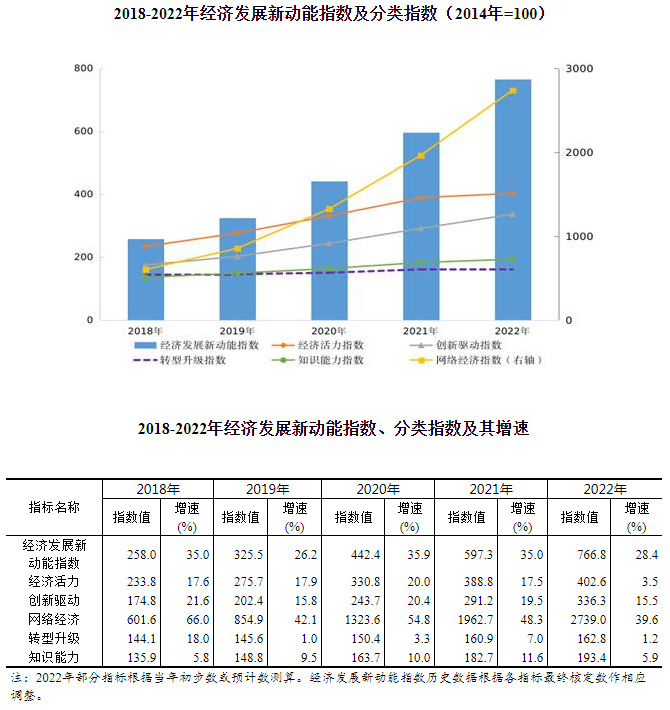 为动态监测我国经济发展新动能变动情况,国家统计局统计科学研究所基于《新产业新业态新商业模式统计监测制度》和经济发展新动能统计指标体系,采用定基指数方法测算了2022年我国经济发展新动能指数,并修订了历史指数数据。结果显示,2022年我国经济发展新动能指数(以2014年为100)为766.8,比上年增长28.4%。2022年,各项分类指数与上年相比均有提升,其中,网络经济指数增长最快,对总指数增长的贡献最大。