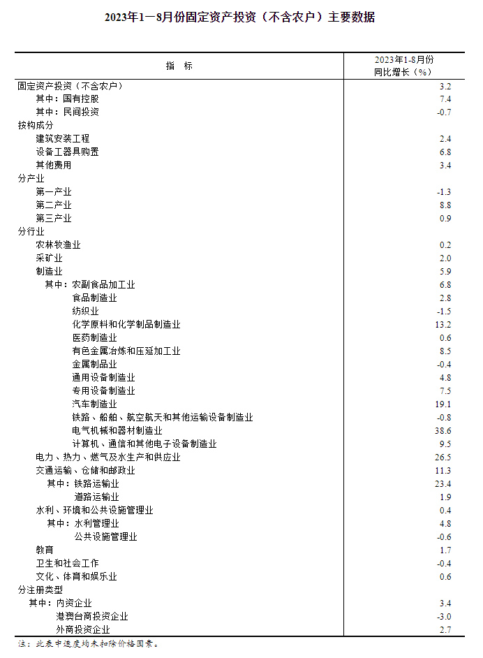 1—8月份,全国固定资产投资(不含农户)327042亿元,同比增长3.2%(按可比口径计算,详见附注7),其中,制造业投资增长5.9%,增速比1—7月份加快0.2个百分点。从环比看,8月份固定资产投资(不含农户)增长0.26%。1—8月份,民间固定资产投资169479亿元,同比下降0.7%。