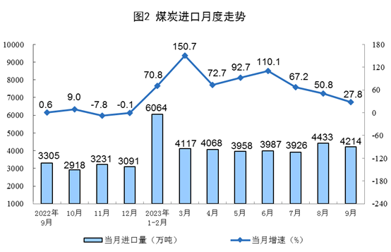 1—9月份,生产原煤34.4亿吨,同比增长3.0%。进口煤炭3.5亿吨,同比增长73.1%。
