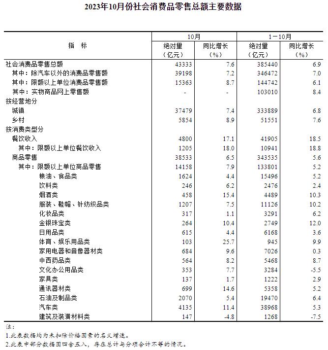 10月份,社会消费品零售总额43333亿元,同比增长7.6%。其中,除汽车以外的消费品零售额39198亿元,增长7.2%。