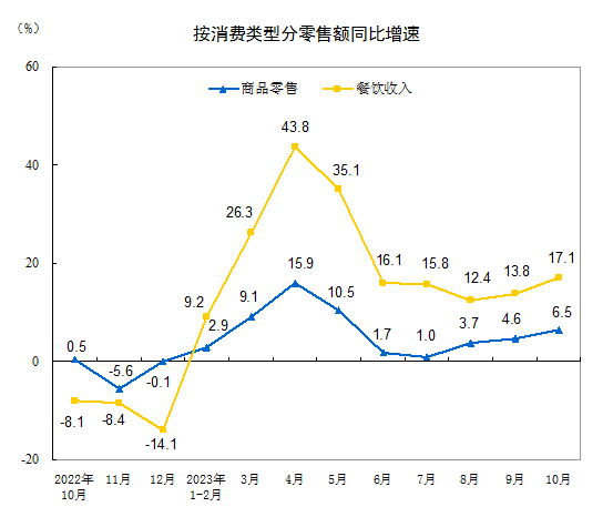 按消费类型分,10月份,商品零售38533亿元,同比增长6.5%;餐饮收入4800亿元,增长17.1%。1—10月份,商品零售343535亿元,同比增长5.6%;餐饮收入41905亿元,增长18.5%。