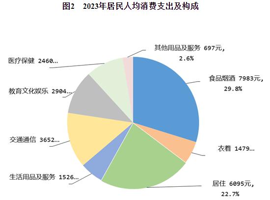 2023年,全国居民人均食品烟酒消费支出7983元,增长6.7%,占人均消费支出的比重为29.8%;人均衣着消费支出1479元,增长8.4%,占人均消费支出的比重为5.5%;人均居住消费支出6095元,增长3.6%,占人均消费支出的比重为22.7%;人均生活用品及服务消费支出1526元,增长6.6%,占人均消费支出的比重为5.7%;人均交通通信消费支出3652元,增长14.3%,占人均消费支出的比重为13.6%;人均教育文化娱乐消费支出2904元,增长17.6%,占人均消费支出的比重为10.8%;人均医疗保健消费支出2460元,增长16.0%,占人均消费支出的比重为9.2%;人均其他用品及服务消费支出697元,增长17.1%,占人均消费支出的比重为2.6%。