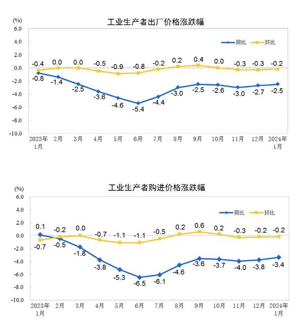 2024年1月份,受国际大宗商品价格波动影响,全国工业生产者出厂价格同比下降2.5%,环比下降0.2%,降幅比上月分别收窄0.2和0.1个百分点;工业生产者购进价格同比下降3.4%,降幅收窄0.4个百分点,环比下降0.2%,降幅与上月相同。