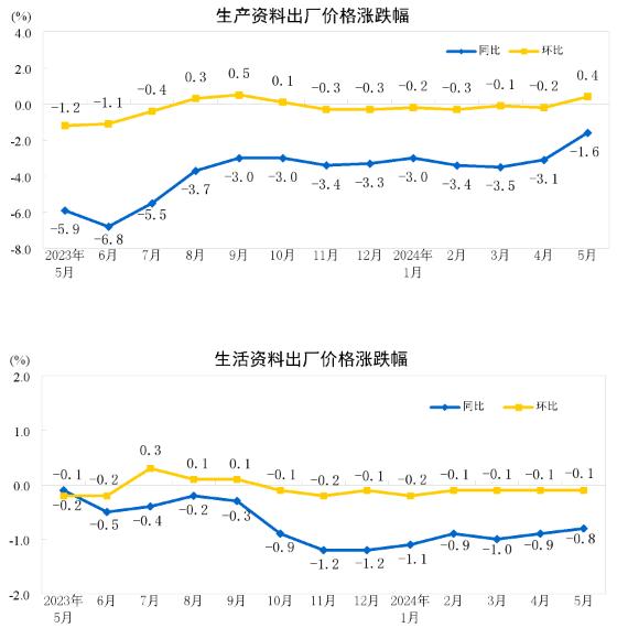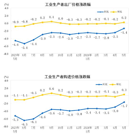2024年5月份,全国工业生产者出厂价格同比下降1.4%,降幅比上月收窄1.1个百分点,环比上涨0.2%,上月为下降0.2%;工业生产者购进价格同比下降1.7%,环比上涨0.3%。1—5月平均,工业生产者出厂价格比上年同期下降2.4%,工业生产者购进价格下降3.0%。