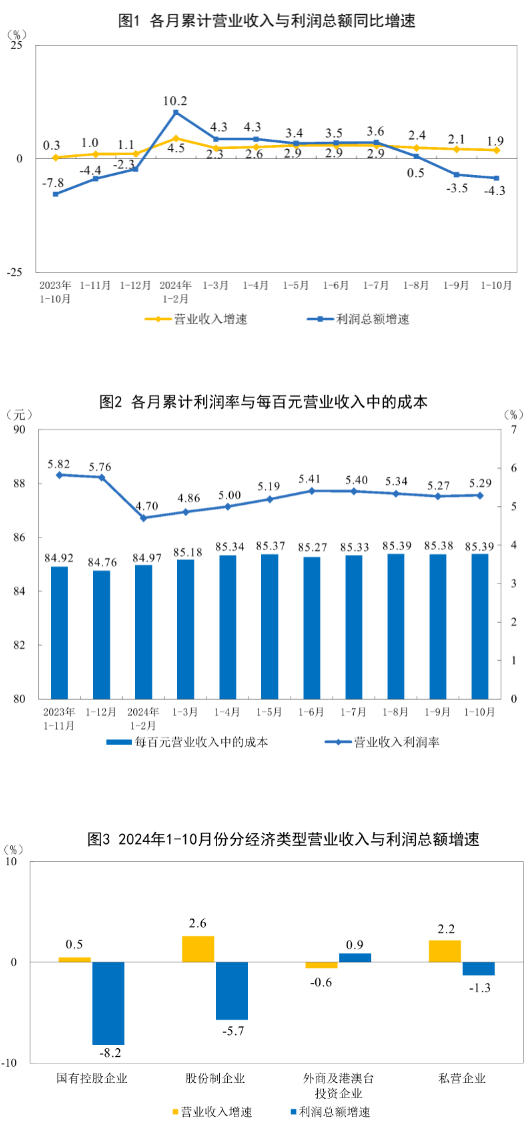 1—10月份,规模以上工业企业实现营业收入110.96万亿元,同比增长1.9%;发生营业成本94.75万亿元,增长2.3%;营业收入利润率为5.29%,同比下降0.34个百分点。
