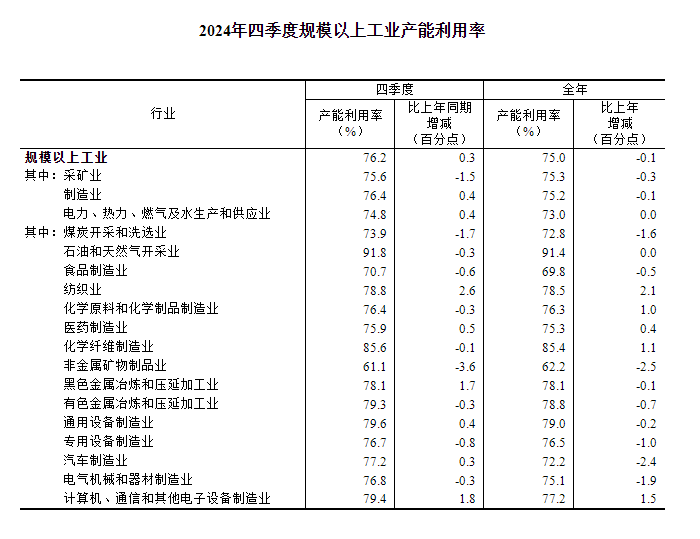 2024年四季度,全国规模以上工业产能利用率为76.2%,比上年同期上升0.3个百分点,比三季度上升1.1个百分点。