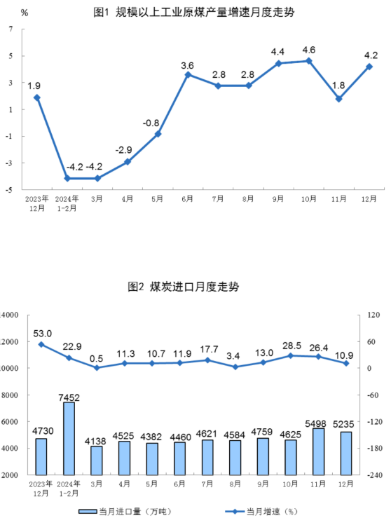 原煤生产增速加快。12月份,规上工业原煤产量4.4亿吨,同比增长4.2%,增速比11月份加快2.4个百分点;日均产量1415.6万吨。进口煤炭5235万吨,同比增长10.9%。