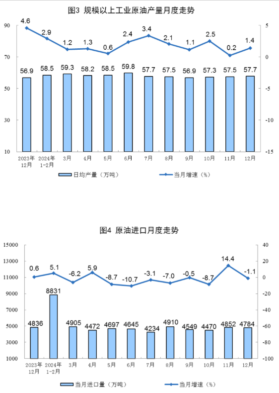 原油生产增速加快。12月份,规上工业原油产量1790万吨,同比增长1.4%,增速比11月份加快1.2个百分点;日均产量57.7万吨。进口原油4784万吨,同比下降1.1%。