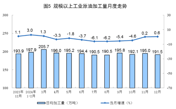 原油加工保持稳定。12月份,规上工业原油加工量5935万吨,同比增长0.6%,增速比11月份加快0.4个百分点;日均加工191.5万吨。2024年,规上工业原油加工量70843万吨,同比下降1.6%。