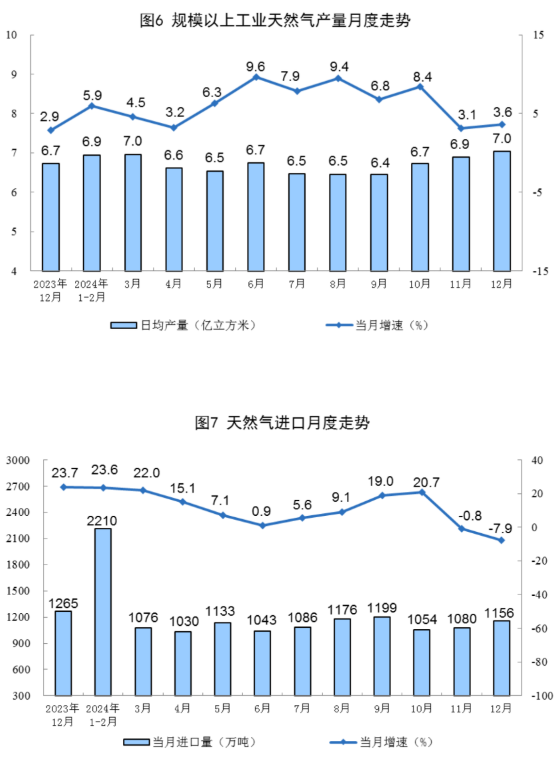 天然气生产稳步增长。12月份,规上工业天然气产量218亿立方米,同比增长3.6%,增速比11月份加快0.5个百分点;日均产量7.0亿立方米。进口天然气1156万吨,同比下降7.9%。