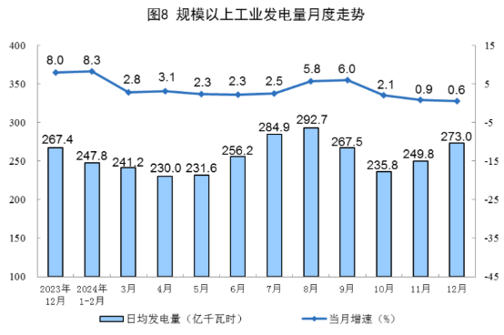 规上工业电力生产平稳增长。12月份,规上工业发电量8462亿千瓦时,同比增长0.6%;规上工业日均发电273.0亿千瓦时。2024年,规上工业发电量94181亿千瓦时,同比增长4.6%。