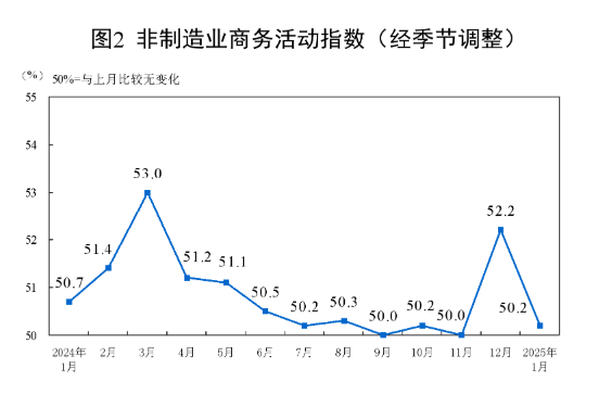 1月份,非制造业商务活动指数为50.2%,比上月下降2.0个百分点,仍高于临界点,非制造业总体保持扩张。