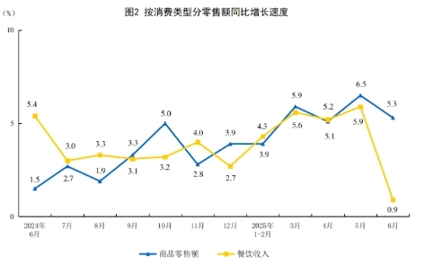 按消费类型分,6月份,商品零售额37580亿元,同比增长5.3%;餐饮收入4708亿元,增长0.9%。1—6月份,商品零售额217978亿元,增长5.1%;餐饮收入27480亿元,增长4.3%。
