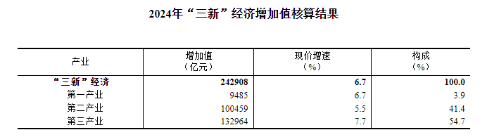 经核算,2024年我国“三新”经济增加值为242908亿元,比上年增长6.7%(按现价计算),比同期国内生产总值(GDP)现价增速高2.5个百分点;占GDP的比重为18.01%,比上年提高0.43个百分点[1]。