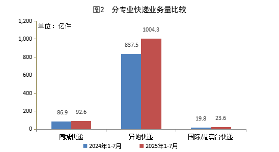 1—7月,同城快递业务量累计完成92.6亿件,同比增长6.5%;异地快递业务量累计完成1004.3亿件,同比增长19.9%;国际/港澳台快递业务量累计完成23.6亿件,同比增长19.2%。