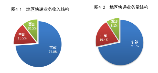 1—7月,东、中、西部地区快递业务收入比重分别为74.0%、15.5%和10.5%,快递业务量比重分别为71.5%、19.4%和9.1%。与去年同期相比,东部地区快递业务收入比重下降0.8个百分点,快递业务量比重下降1.4个百分点;中部地区快递业务收入比重上升0.5个百分点,快递业务量比重上升0.9个百分点;西部地区快递业务收入比重上升0.3个百分点,快递业务量比重上升0.5个百分点。