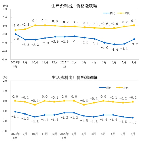 2025年8月份,全国工业生产者出厂价格同比下降2.9%,降幅比上月收窄0.7个百分点,环比由下降0.2%转为持平。工业生产者购进价格同比下降4.0%,环比持平。1—8月平均,工业生产者出厂价格比上年同期下降2.9%,工业生产者购进价格下降3.3%。
