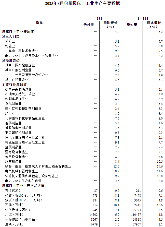 8月份,规模以上工业增加值同比实际增长5.2%(增加值增速均为扣除价格因素的实际增长率)。从环比看,8月份,规模以上工业增加值比上月增长0.37%。1—8月份,规模以上工业增加值同比增长6.2%。
