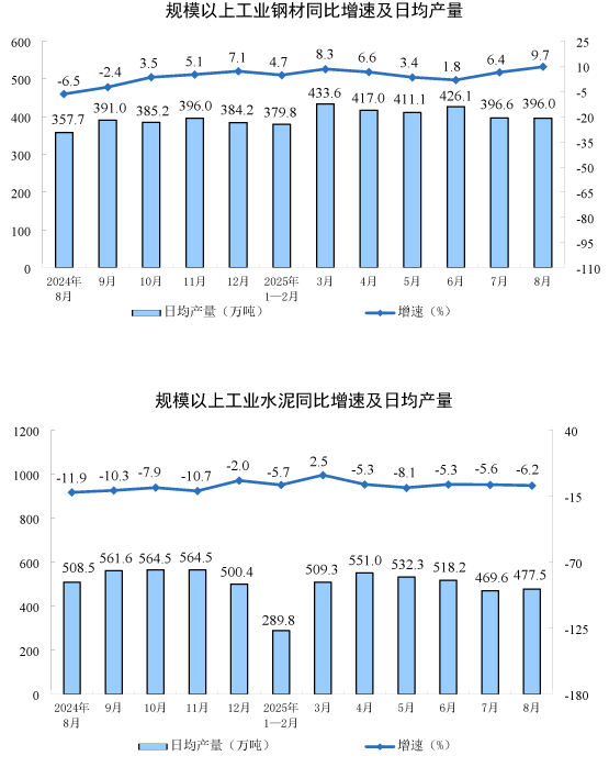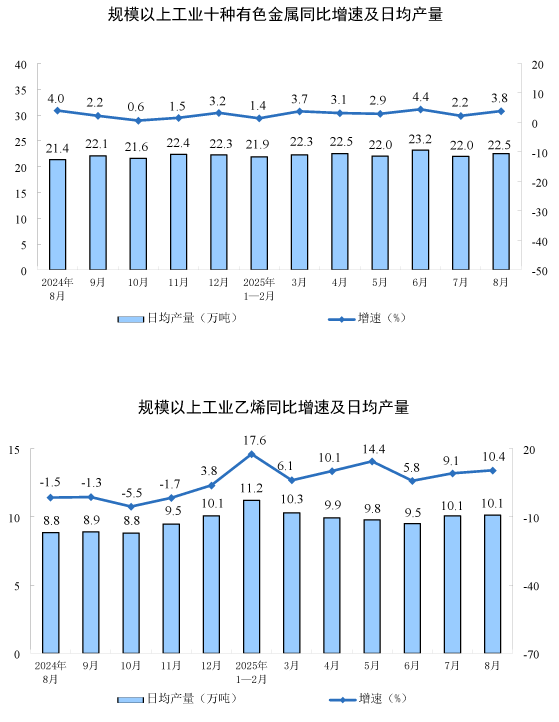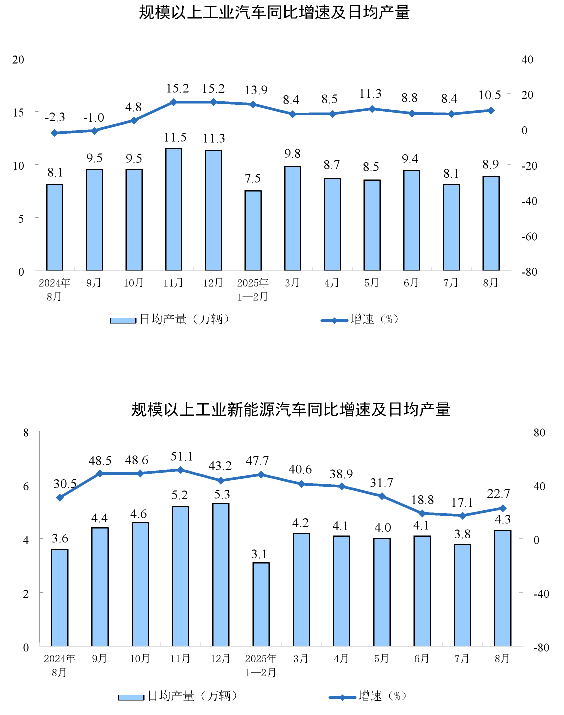 分产品看,8月份,规模以上工业623种产品中有319种产品产量同比增长。其中,钢材12277万吨,同比增长9.7%;水泥14802万吨,下降6.2%;十种有色金属698万吨,增长3.8%;乙烯314万吨,增长10.4%;汽车275.2万辆,增长10.5%,其中新能源汽车133.3万辆,增长22.7%;发电量9363亿千瓦时,增长1.6%;原油加工量6346万吨,增长7.6%。
