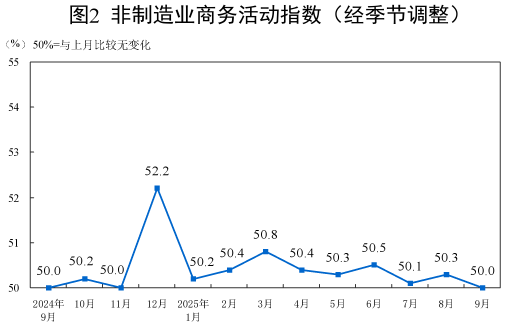 9月份,非制造业商务活动指数为50.0%,比上月下降0.3个百分点,位于临界点,非制造业业务总量总体稳定。