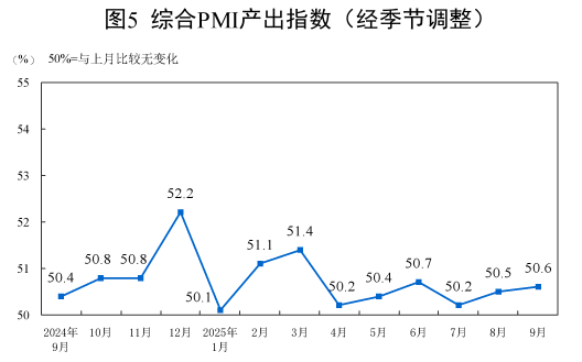 9月份,综合PMI产出指数为50.6%,比上月上升0.1个百分点,持续高于临界点,表明我国企业生产经营活动总体扩张继续加快。