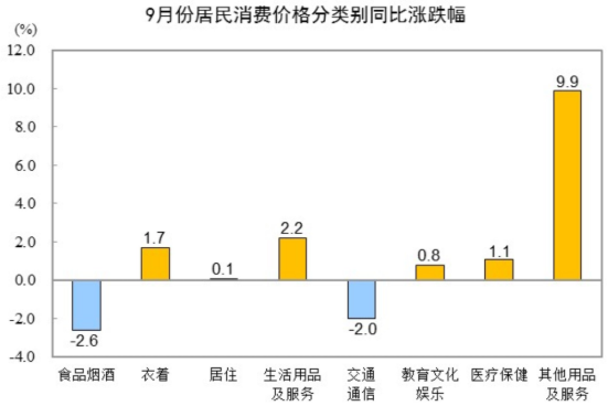 9月份,食品烟酒类价格同比下降2.6%,影响CPI(居民消费价格指数)下降约0.74个百分点。食品中,鲜菜价格下降13.7%,影响CPI下降约0.35个百分点;蛋类价格下降11.9%,影响CPI下降约0.08个百分点;畜肉类价格下降8.4%,影响CPI下降约0.27个百分点,其中猪肉价格下降17.0%,影响CPI下降约0.26个百分点;鲜果价格下降4.2%,影响CPI下降约0.09个百分点;粮食价格下降0.7%,影响CPI下降约0.01个百分点;水产品价格上涨0.9%,影响CPI上涨约0.02个百分点。