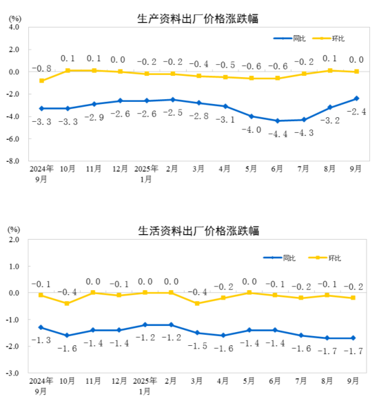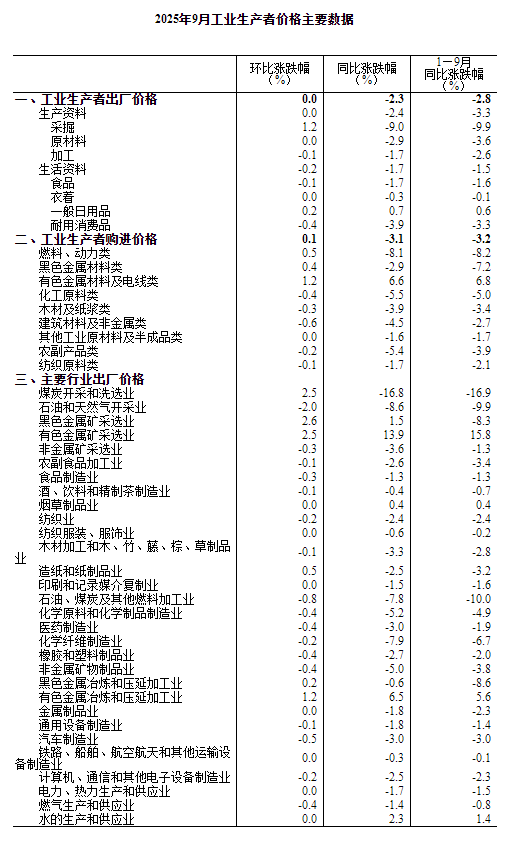 2025年9月份,全国工业生产者出厂价格同比下降2.3%,降幅比上月收窄0.6个百分点,环比继续持平。工业生产者购进价格同比下降3.1%,降幅比上月收窄0.9个百分点,环比上涨0.1%。1—9月平均,工业生产者出厂价格比上年同期下降2.8%,工业生产者购进价格下降3.2%。