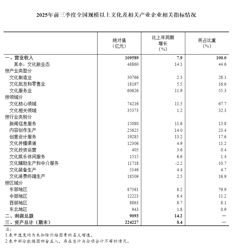 据对全国8.1万家规模以上文化及相关产业企业(以下简称“文化企业”)调查,2025年前三季度,文化企业实现营业收入109589亿元,按可比口径计算(详见附注2),比上年同期增长7.9%[1]。其中,文化新业态特征较为明显的16个行业小类[2]实现营业收入48860亿元,比上年同期增长14.1%,快于全部规模以上文化企业6.2个百分点。