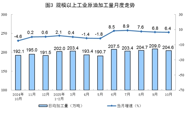 原油加工平稳增长。10月份,规上工业原油加工量6343万吨,同比增长6.4%;日均加工204.6万吨。