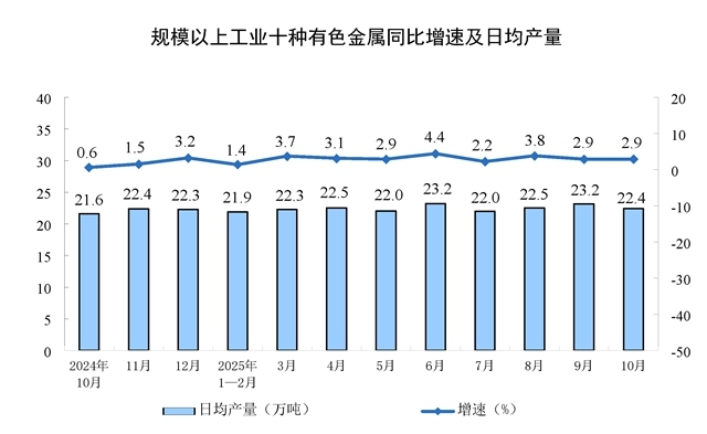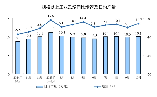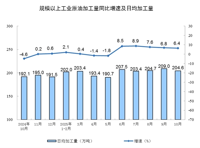分产品看,10月份,规模以上工业623种产品中有313种产品产量同比增长。其中,钢材11864万吨,同比下降0.9%;水泥14775万吨,下降15.8%;十种有色金属695万吨,增长2.9%;乙烯314万吨,增长11.7%;汽车327.9万辆,增长11.2%,其中新能源汽车171.0万辆,增长19.3%;发电量8002亿千瓦时,增长7.9%;原油加工量6343万吨,增长6.4%。