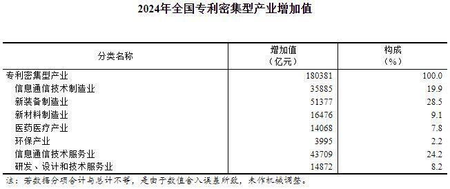 经核算,2024年全国专利密集型产业增加值为180381亿元,占国内生产总值(GDP)的比重为13.38%,比上年提高0.34个百分点。