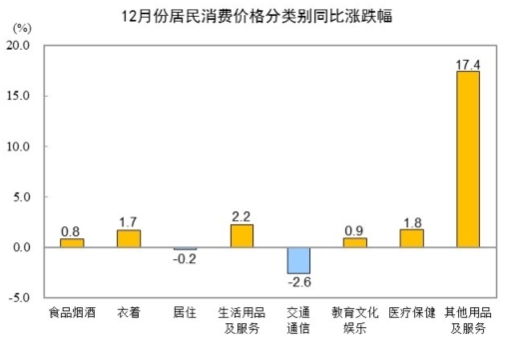 12月份,食品烟酒类价格环比上涨0.2%,影响CPI上涨约0.05个百分点。食品中,鲜果价格上涨2.6%,影响CPI上涨约0.05个百分点;鲜菜价格上涨0.8%,影响CPI上涨约0.02个百分点;畜肉类价格下降0.8%,影响CPI下降约0.02个百分点,其中猪肉价格下降1.7%,影响CPI下降约0.02个百分点。