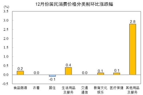 12月份,全国居民消费价格环比上涨0.2%。其中,城市上涨0.2%,农村上涨0.2%;食品价格上涨0.3%,非食品价格上涨0.1%;消费品价格上涨0.3%,服务价格持平。