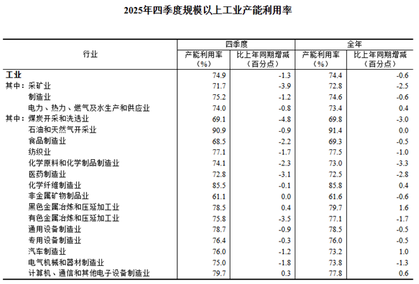 2025年四季度,全国规模以上工业产能利用率为74.9%,比三季度上升0.3个百分点,比上年同期下降1.3个百分点。2025年全国规模以上工业产能利用率为74.4%。