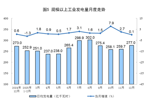 规上工业电力生产保持增长。12月份,规上工业发电量8586亿千瓦时,同比增长0.1%;日均发电量277.0亿千瓦时。1—12月份,规上工业发电量97159亿千瓦时,同比增长2.2%。
