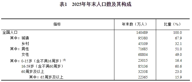 [6]2025年末,0-14岁(含不满15周岁)人口为21276万人,15-59岁(含不满60周岁)人口为86875万人。