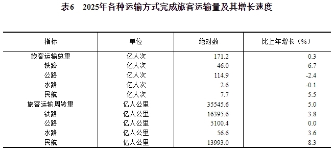 [32]2025年调整网约车载客系数,相应对出租汽车城市客运量等指标本年度及上年同期数据进行调整。2025年旅客运输总量、旅客运输周转量、公路旅客运输量、公路旅客运输周转量增速按可比口径计算。